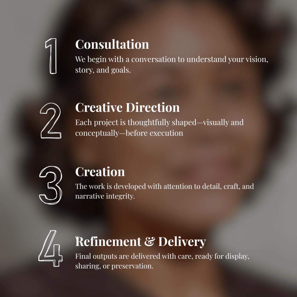 Whether capturing a portrait, restoring a photograph, or developing a visual narrative, each project is approached as both craft and storytelling. The goal is not simply to create images—but to shape how moments, memories, and identities are seen and remembered.