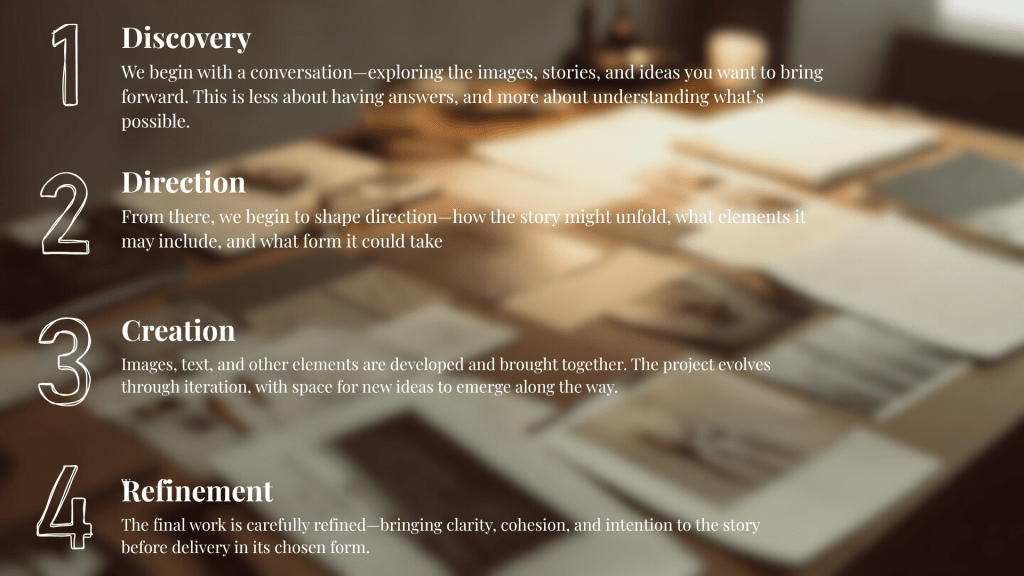 If you have images, fragments, or even just a sense of something you want to explore, that’s enough to begin. We’ll shape the direction together—guided by what the story holds and what it can become.